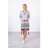We present you a comfortable dress, Dress with a hood and a print, Print on the front and on the hood, The dress has a longer back, Decorative tapes on the sides, The dress is made of high quality material, The size is universal and will be suitable for ladies wearing sizes S, M or L, Composition: 90% Cotton, 10% Elastane Dimensions: Underarm width: 54 cm Sleeve length from armpit: 42 cm Sleeve length from the shoulder: 47 cm Total length front: 85 cm/back: 95 cm The width of the hips: 55 cm