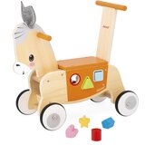 Mali magarac jedva čeka da otkrije svet, a ni beba! Sa ovom drvenom nosiljkom za magarce, krecete ka novim avanturama, vec od 12 meseci. Hajde, hu! Jašuci svoju nosiljku, beba razvija osecaj za ravnotežu i krupnu motoriku, dok otkriva svoju okolinu. Želite da gurate svoju igračku ili da budete gurnuti? Zahvaljujuci dršci na poleđini! Na koji god način vaš mališan koristi svoju nosiljku, naučice da kontroliše svoju težinu i odlično se provede. Mali dodatak za ovu igračku za rano učenje? Kutija sa oblicima je uključena, sa 6 oblika za umetanje i vađenje sa prednje strane, tako da možete početi sve ispočetka. Savršeno za vežbanje spretnosti! Na kraju, ali ne i najmanje važno, 4 gumena točka su tiha i pružaju dobar hvat, tako da možete šetati u potpunom miru. Idealna za podsticanje krupne motorike i jačanje potpore za hodanje, ova drvena nosiljka je prava atrakcija, sa svojim malim filcanim ušima i nežnim bojama. Bez obzira da li vaš mališan voli životinje na farmi ili jednostavno kaska, bice oduševljen! Ova igračka za rano učenje napravljena je od FSC sertifikovanog drveta iz održivo upravljanih šuma.