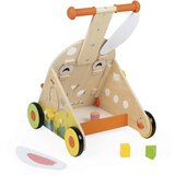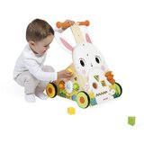 Jupi! Napravite mesta za najslađeg zeku ikada! Naš beli zeka sa velikim očima je uvek spreman za šetnju i otkrivanje sa bebom! Ova drvena kolica za više aktivnosti su savršena za decu uzrasta od 1 godine i više, zahvaljujuci mnogim malim igrama na 3 strane! Sve se vrti oko zabave i razvoja fine motorike i spretnosti uz 9 razigranih aktivnosti našeg nestašnog zeca: krug sa šargarepom, kutija tradicionalnog oblika i mali miš za klizanje kroz lavirint na prednjoj strani, lavirint sa pčelama na jednoj strani, zupčanici i zvučno sunce na drugoj strani. Velike oči našeg zeca se okrecu, a njegovi obrazi su napravljeni od filca, kao i njegove uši, kako bi se razvio dečji osecaj dodira. Evo jedne zabavne karakteristike: uši se mogu ukloniti zahvaljujuci čičak trakama, tako da se mogu menjati položaj po želji! Ova slatka kolica za aktivnosti su posebno pogodna za učenje hodanja. Zahvaljujuci dršci koja se može podesiti po visini (od 46 do 53 cm), mogu se prilagoditi visini vašeg deteta. Mogu pratiti vaše dete od 12 meseci do 3 godine. Radi bezbednosti, opremljen je lako podesivom kočnicom na točkovima, koja se može podesiti u 3 položaja (potpuno zaključavanje, smanjena brzina, normalna brzina), kako bi se postepeno otpuštale i kontrolisala brzina kolica kako vaše dete uči. Drvena kolica za hodanje sa kočnicom su idealna za mirne šetnje. Konačno, imaju 4 tiha gumena točka. Ponuda bebi kolica za hodanje znači da može naučiti da hoda sa samopouzdanjem i sopstvenim tempom: naizmenično hodajuci i raznim igrama, uči da savladava svoje okruženje i nikada se ne umara od aktivnosti koje se nude. Čitava porodica ce voleti da gleda kako se beba krece po kuci sa svojim slatkim kolicima u obliku zeca, napravljenim od FSC sertifikovanog drveta. Sve što preostaje je da pronađete ime za ovog novog prijatelja!