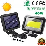 Solarni Reflektor Sa Odvojenim Panelom 40W sa 5 metra kabla, savršeno i ekonomično rešenje za osvetljenje i spoljnu sigurnost stambenih ulica, bašta, parkinga, puteva i dvorišta.Stvara veoma snažno i jako svetlo sa odličnim kvalitetom koje poboljšava osvetljenje i nocnu vidljivost. Automatsko paljenje i gašenje 5 metra kabla Radno vreme: 810 sati Senzor pokreta Snaga solarnog panela: Monokristalni silikonski solarni paneli takođe mogu da napune 5,5 V, 1,5 W u oblačnim i kišnim danim Baterija: Litijumska baterija 2400mA Snaga 40W Led sijalice 100 kom Indukciona udaljenost: 46 metara Boja kucista: crna