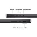 Ekran 14.2'', Liquid Retina XDR, 1000000:1 contrast ratio, True Tone technology, Wide color (P3), 1000 nits sustained fullscreen, 1600 nits peak (HDR content only), do 120Hz Rezolucija: 3024 x 1964 Procesor Apple M4 Pro Dodeca Core Processor Procesor sa 12 jezgara (10 performance core i 4 efficiency core) 16 jezgarni grafički čip 16 jezgarni Neural Engine Memorija 16GB Hard disk 512GB SSD Graficka karta Integrisana Apple M4 Pro sa deljenom sistemskom memorijom 10Core Operativni sistem Apple MacOS Sequoia Mreza WiFi 6E (802.11ax) Bluetooth 5.3 Slotovi 3 x Thunderbolt 5 (podržavaju DisplayPort, Thunderbolt 5, Thunderbolt 4, USB 4 i punjenje) 1 x HDMI 1 x 3.5mm kombo audio port 1 x MagSafe 3 port za punjenje 1 x SDXC čitač kartica Kamera HD 720p Audio Zvučni sistem sa 6 zvučnika Baterija 72.4Wh Fizicke karakteristike Dimenzije: 322.6mm x 221.2mm x 15.5mm Kućište: Aluminium Masa: 1.55kg Boja: Crna (Space black) Slovni raspored tastera: US Pozadinsko osvetljenje tastature