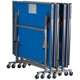 Vrhunski sto za stoni tenis, podloga je plave boje, montažnog tipa sa točkićima, sa mogućnošću samostalnog igranja na polovini stola. odobren od strane ITTF,takmičarski sto dvodelna konstrukcija omogućava da se više stolova uskladišti na malom prostoru zbog odličnog kvaliteta ovog stola i ostvarene uštede prostora, idealan je za klubove debljina ploče je 25mm ima gumene točkove prečnika 100mm kojima se nezavisno upravlja nogice stola su od čelika, dimenzije 100x100mm ima sistem podešavanja visine na nogicama podloga za igranje je "Perfect Grip" (ekstra brza sa konstantnim odskokom loptice) svaka polovina stola ima svoj nezavisan sigurnosni sistem montiranja dimenzije stola spremnog za igru: 275 x 152.5 x 76 cm dimenzije stola kad je uskladišten: 152.5 x 139.2 x 14.4 cm težina neraspakovanog stola je 118kg napomena: mrežica nije uključena u paket !!!