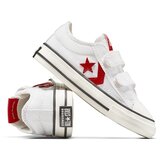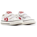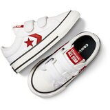 Converse Star Player 76 2V su dečije patike sa dva čičaktraka, olakšavajući obuvanje i pružajući sigurno prianjanje. Gornjište je izrađeno od platna u crnoj boji sa belim detaljima, dok gumeni đon pruža dobar prijem na različitim podlogama. Prepoznatljiv Star Chevron logo na bočnim stranama dodatno ističe retro karakter modela.