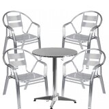 Praktična baštenska garnitura od aluminijuma. Dobijate 4 stolice i 1 sto. Materijal: aluminijum Dimenzije stolice: 56x57x75cm Dimenzija cevi stolice: fi25*1.0mm Dimenzije stola: fi60x70cm Dimenzija cevi stola: fi58*1.0mm
