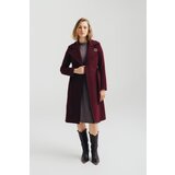 Prepoznatljiv kaput u bordo nijansi koji odiše elegancijom i ženstvenošću. Model sa naglašenim reverima i pojasom koji definiše struk donosi klasičan kroj u modernom izdanju. Ukrasna broš aplikacija dodatno ističe sofisticiran karakter ovog kaputa, čineći ga idealnim izborom za poslovne i svečane prilike.
