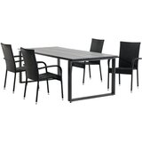Baštenska garnitura Set STO + 4 Stolice Dimenzije stola:Širina: 100 cm, Dužina: 215 cm, Visina: 75 cm Materijal:Ram: aluminijum, Površina stola: Durawood Boja: Siva Dimenzije stolice:Širina: 55 cm, Visina: 94 cm, Dubina: 63 cm Materijal:Konstrukcija: čelik, Naslon: petan, Sedalo: petan, Naslon za ruke: petan Boja: Crna Stolica je složiva jedna na drugu