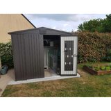 vrhunski kvalitet, robusna konstrukcija 20godišnja garancija * materijali vrhunskog kvaliteta: vruce pocinkovana čelična ploča obložena poliamidom * izuzetno stabilan, podnosi opterećenje snega do 150kg/m2 i otporno na oluju (150 km/h, snaga vetra 12) priključni delovi: zavrtnji, navrtke, vijci i šarke od nerđajuceg čelika cilindrična brava sa rotirajućom ručkom (uključen rezervni ključ) lako se sklapa uz foto ilustrovan priručnik za montažu priključni delovi: zavrtnji, navrtke, vijci i šarke od nerđajuceg čelika širok spektar standardne opreme uključen Police / potporne šine: Sastoji se od 2 police (dubina: 24,5 cm, širina: 72 cm) i 2 potporne šine. Izrađen od toplo pocinkovanog čeličnog lima Nosivost maks. 15 kg za svaku policu Lako se naknadno instalira 4 vešalice za alat: Izrađen od toplo pocinkovanog čeličnog lima Nosivost oko 10 kg Za kačenje lopatica, grablji, baštenskih creva i drugog baštenskog alata Lako sklapanje sa jednostavnim klikom na mesto Sistem organizatora Integrisani sistem organizatora unutar krila vrata za kačenje alata i drugih malih predmeta Uključeno 6 kuka za vešanje 2 integrisana oluka 2 integrisana oluka sa priključkom 1" za baštensko crevo (nije uključeno) za sakupljanje i odvođenje kišnice Cilindrična brava sa okretnim rukohvatom Dvostruki mehanizam za zaključavanje obezbeđuje sigurnost od neželjenog ulaska Konstrukcija vrata je izuzetno stabilna Uključen rezervni ključ Spoljašnje dimenzije, uključujući nastrešicu, Š x D x V (cm):244 x 156 x 203 Unutrašnje dimenzije:222 x 150 x 195 Š x D x V (cm) tezina: 129 kg Otvaranje vrata:135 x 170 Š x V (cm) boja: metalik tamno siva standardna oprema:Integrisani organizacioni sistem sa unutrašnje strane vrata (uključujući 6 kuka) Nosač za alat (4 kom.) Police (2 kom.) i potporne šine (2 kom.) 2 integrisana oluka sa priključkom 1" za baštensko crevo (nije uključeno) za sakupljanje i odvođenje kišnice Cilindrična brava sa okretnim rukohvatom Dimenzije temelja:227 x 155 Š x D (cm)