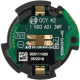 Mogućnosti zavise od vrste alata. Što je elektronika na alatu naprednija, veće su mogućnosti. LED Svetlo uključi/isključi, podešavanje osvetljenosti, podešavanje vremena za isključivanje svetla. Informacije o alatu naziv alata, specifikacija alata, upotreba alata, servisne informacije o rezervnim delovima i lakom pronalasku istih, čak i kada se ošteti štampana pločica na alatu Planiranje servisnih intervala, gde je vreme rada alata prikazano Notifikacije kada je meki start ili kick back kontrola isključena Korisnik dobija obaveštenja o problemu i predlog rešenja problema tako da nema potrebe za čitanjem uputstva Korisnik dobija upozorenje kada se alat zaustavi Šalje obaveštenja, upozorenja i podsetnike u slučaju promena statusa i drugih događaja Bežična tehnologija Bluetooth Omogućeno povezivanje s više uređaja Domet: 30 m Napajanje: baterija CR 2032, 3 V Dimenzije: 30 7 mm Masa: 0,01 kg. Bosch modul GCY 42 Kartonska kutija Uputstvo za upotrebu