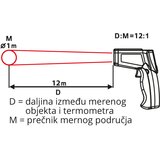 Daljinski infracveni termometar sa osvetljenim LCD displejem Poseduje laser za precizno određivanje merne površine Omogućava brzo i lako beskontaktno merenje temperature željenog objekta ili površine Može se birati između skale u C ili F Prikazuje maksimalnu izmerenu temperaturu Automatski se isključuje, time štedeći bateriju Indikacija slabe baterije omogućava blagovremenu zamenu istrošene baterije Tip Infracrveni termometar Napajanje 2 x AAA 1.5V baterije (u sklopu) Prikaz C / F Temperaturni opseg 50C do +380C (58F do +716F) Preciznost 2% ili 2C Emisivnost 0.1 do 1.0 Rezolucija 0.1C ili 0.1F Vreme odziva talasne dužine 500 ms (814)um Odnos daljine i mernog područja 12:1 Nije namenjen za merenje temperature ljudskog tela