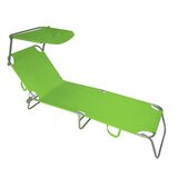 Ležaljka na rasklapanje dimenzija 24x184x55 cm, sa tendom 54x49 cm. Konstrukcija je izrađena od čeličnih cevi prečnika 18 mm. Materijal: poliester 600 D. Ukupna nosivost iznosi 120 kg. Mogućnost podešavanja nagiba uzglavlja. Poseduje ušivene ručke za lakše nošenje.