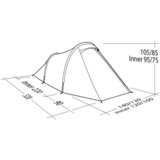 Šator za dve osobe sa brzim postavljanjem Tkanina ne gori, ali se topi u direktnom kontaktu sa plamenom. Čvrsta, fleksibilna i izdržljiva traka zalepljena je i termozapečacena preko šavova letaka za efikasnu dugotrajnu hidroizolaciju u ovom kritičnom području. Sa mrežom protiv komaraca za ventilaciju i zaštitu od insekata. Spoljašnjost od HydroTex Core, 75D poliester 190T, 100% poliester, fire retardant, Hydrostatic Head 3000 mm Unutrašnjost: 68D poliester 190T, 100% prozračni poliester Pod od 75D poliester tafta 185T, 100% poliester, 6 000 mm Šipke: Aluminium 7001T6, 8.5 mm, anodised 2 sleeps Speed test: max 150 km/h prosečno 115 km/h Težina: 2,3 kg Veličina: 43 17 m