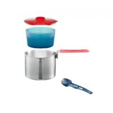 Od nerđajućeg čelika 188 (304). Čvrsta šerpa od nerđajuceg čelika, laka za održavanje, sklopiva ručka. Torba. Šerpa, poklopac / cediljka, činija, sklopiva kašika/viljuška. Sklopiva ručka zaključava poklopac, torba. 305 g. 13,5 x 11 cm. Set je pogodan za svaki tip vatre (drva, plin, indukcija). 1 merna posuda sa 1 patentiranom sklopivom ručkom. (950 ml iskoristivo, 197 g, 13,5 cm x 11 cm). 1 činija sa strukturom koja smanjuje gubitak toplote (0,45 litara iskoristivo, 13 x 6,5 cm, 46 g). 1 sklopiva kašika / viljuška (11 g, dužina: 18,5 cm). 1 poklopac / cediljka (35 g), 1 torba za prenošenje.