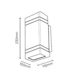 Zidna lampa atraktivnog izgleda za spoljašnju upotrebu, zahvaljujući IP65 zaštiti Kućište je od aluminijuma i garantuje dugotrajnu upotrebu Poseduje dva sijalična grla tipa GU10, a svetlosni snop se prostire gore i dole Prodaje se bez sijalica Tip Lampa sa grlom Montaža Nazidna Napajanje 220240 V / 5060 Hz Grlo 2 x GU10 (maks. opterećenje 35 W) Materijal kućišta Aluminijum / staklo Boja kućišta Crna IP zaštita IP65 Dimenzije (D) 100 x (V) 230 x (Š) 100 mm Ostale napomene Sijalice se kupuju zasebno