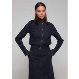 Ova teksas bluza u tamnoplavom tonu donosi modernu interpretaciju klasičnog džinsa. Dugih rukava i ravnog kroja, ukrašena je kontrastnim šavovima i dekorativnim štepovima koji naglašavaju siluetu. Kopča se nizom metalnih dugmadi u retro stilu, dok kragna i pažljivo oblikovani detalji na prednjem delu unose dozu autentičnosti. Zahvaljujući svestranom dizajnu, može se nositi samostalno ili u kombinaciji sa teksas suknjom ili pantalonama za potpuni denim izgled.