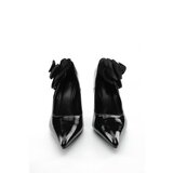 Unesite sofisticiranu dozu glamura u svoj izgled uz crne lakovane salonke sa efektnim cvetnim detaljem sa strane . Elegantna silueta sa špicastim vrhom vizuelno izdužuje noge, dok visoka potpetica dodaje ženstvenost i samopouzdanje. Sjajna lakovana površina u kontrastu sa mekim, trodimenzionalnim cvetom stvara upečatljiv modni akcenat, idealan za večernje prilike, svečane događaje i posebne trenutke kada želite da zablistate.