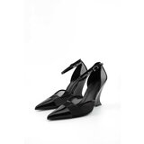 Ove crne salonke modernog dizajna kombinuju eleganciju i udobnost zahvaljujući stabilnoj punoj peti neobičnog oblika. Gornji deo izrađen je od kombinacije providne mrežaste tkanine i lakirane eko kože. što modelu daje savremen i atraktivan izgled. Špicasti vrh vizuelno izdužuje figuru, dok tanak kaišić oko zgloba pruža dodatnu stabilnost i ženstvenu notu. Idealne su za večernje izlaske i posebne prilike kada želite da spojite stil i praktičnost.