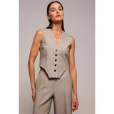 Ovaj sivi prsluk prefinjenog kroja spaja bezvremensku klasiku sa modernim akcentima. Čiste linije i elegantan V izrez naglašavaju sofisticiranost, dok donji rub oblikovan u blagom špicu unosi dinamiku i vizuelno izdužuje figuru. Kontrastna crna dugmad ističu svedenu estetiku i daju komadu poseban pečat. Zahvaljujući pažljivo oblikovanom kroju, prsluk se odlično uklapa uz pantalone istog tona, stvarajući skladnu i ženstvenu siluetu. Idealan je izbor kako za poslovne prilike, tako i za večernje kombinacije kada želite da svom stilu dodate notu prefinjene elegancije.