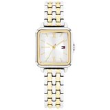 Tommy Hilfiger ženski kvarcni sat ima 24mm bikolorno kvadratno kućište, srebrni brojčanik i bikolornu narukvicu od nerđajućeg čelika. Vodootpornost sata je 3 ATM.