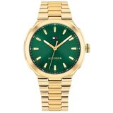 Tommy Hilfiger ženski kvarcni sat ima 36mm zlatno kućište, zeleni brojčanik, mineralno staklo i zlatnu narukvicu od nerđajućeg čelika. Vodootpornost sata je 3 ATM.