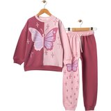 Trenerka komplet za devojčice 311 godinaKomplet trenerka za devojčice u kombinaciji roze i bordo boje sa velikim printom leptira. Gornji deo dugih rukava ima moderan dizajn sa podeljenim bojama i upečatljivim motivom leptira, dok donji deo čine udobne pantalone sa lastišem u struku i printom leptira i zvezdica. Set je izrađen od prijatnog pamuka i pruža maksimalnu udobnost tokom celog dana.