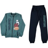 Trenerka za dečake Koledžica 69 godina Sportska trenerka za dečake u kompletu gornji deo sa rajsferšlusom i donji deo sa elastičnim pojasom i ranflama. Dukserica je ukrašena motivima sportskih lopti i natpisom CHAMPIONS , dok su pantalone jednostavne, tamne boje, takođe sa istim natpisom sa strane. Udoban pamučni materijal pruža komfor tokom igre i svakodnevnih aktivnosti.