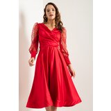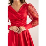 Product Specials: Women's midi evening dress with a doublebreasted collar, flared chest, long sleeves, glittery fabric feature, slits and a train, and a colormatching lining. Product Length: 120 cm (The product lengths may vary by 12 cm) Model Measurements: Height: 1.75 Chest: 88 Waist: 62 Hips: 90 Sample Size: M/38 Fabric Content: 100% Polyester Washing Instructions: It can be dry cleaned. Attention! Our products are sent with a security band. Returns of products that do not have a security band will not be accepted.